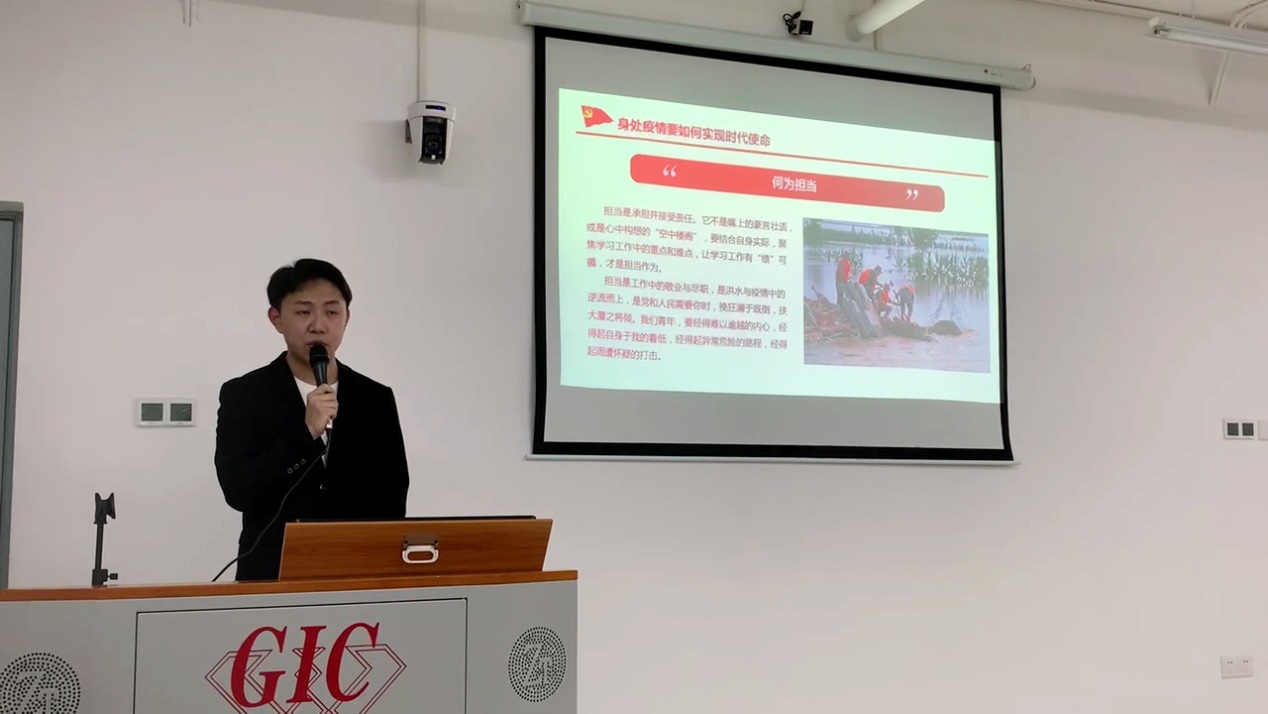 2021級研究生郭曉結合當今疫情現狀,用抑揚頓挫的語調針對“兩會背景下,身處疫情的我們如何實現時代使命”這一主題向大家娓娓道來。其中,郭曉學長重點強調了當代青年的使命與擔當,鼓勵大家要結合具體實際、自身實際,聚焦學習工作中的重點與難點進行擔當作為。