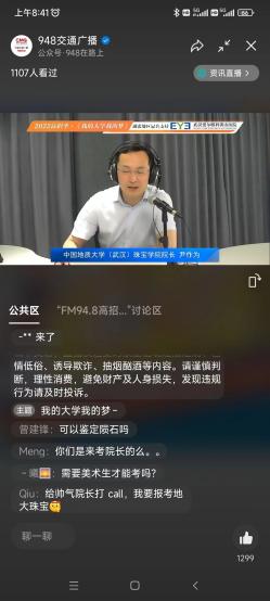節(jié)目同時(shí)通過中國交通廣播FM94.8、中央廣播電視總臺(tái)官方音頻客戶端“云聽”、微信訂閱號(hào)“948在路上”、視頻號(hào)“948交通廣播”進(jìn)行直播,上千人聆聽收看了節(jié)目,并與尹作為教授進(jìn)行了積極地互動(dòng)交流。