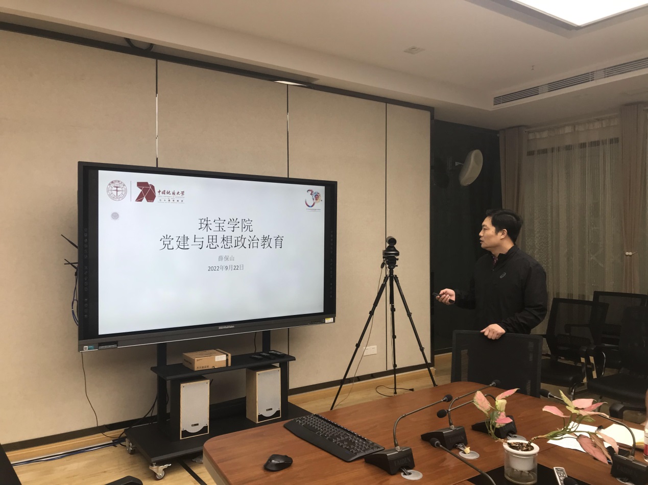 院黨委書記薛保山就學院黨建與思想政治教育工作情況進行了匯報。薛保山從珠寶學院教職工基本情況、黨的建設、黨風廉政建設、巡視巡察工作、存在的問題和不足等五個方面作了詳細匯報,并提出工作建議。
