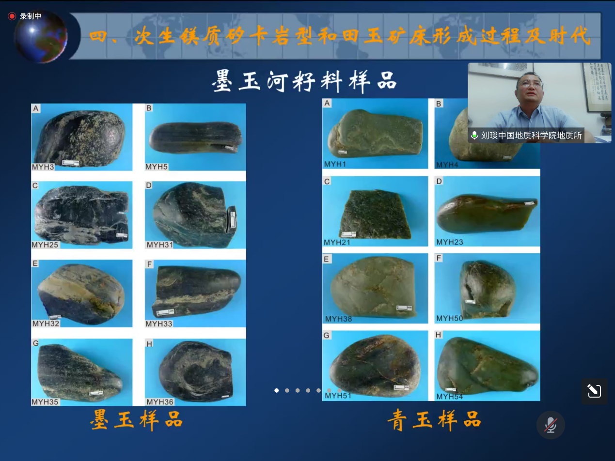 劉琰研究員近十年來一直從事碳酸鹽型稀土礦床的研究工作和鎂質矽卡巖礦床(含和田玉)研究,此次學術報告重點講述《中國礦產地質和田玉礦卷》的研究成果,涉及原生/次生鎂質矽卡巖型和田玉礦床形成過程及時代,和田軟玉山料礦床成因及年齡。根據西昆侖的區域地質特征、接觸交代變質、礦物共生組合和巖相學特征認為和田鎂質矽卡巖原生和次生礦床是接觸交代變質為主的鎂質矽卡巖礦床,總結出全國各主要和田玉礦床的成礦規律,劃分了成礦帶,明確了主要和田玉礦床的成礦時代和顏色成因。同時也分享了韓國春川軟玉的礦物組成與結構特征,春川軟玉的鋯石U-Pb年齡及同位素特征,分析韓國軟玉的成因和形成時代約束。