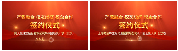 大會舉行了深圳詩普琳珠寶有限公司、周大福珠寶金行(深圳)有限公司、深圳市粵豪珠寶有限公司等向中國地質大學(武漢)捐款和贈送賀禮儀式,同時舉行中國地質大學(武漢)與周大生珠寶股份有限公司、上海豫園珠寶時尚集團有限公司簽訂校企合作協議儀式。根據協議,雙方面將就共建珠寶工程技術研究中心、聯合開展科技創新、實驗室資源共享、開發新技術新產品、聯合培養人才、開展企業內訓、專家互聘、共建學生實踐教學基地和研究生工作站等方面開展深入合作,深入推進產教融合發展。
