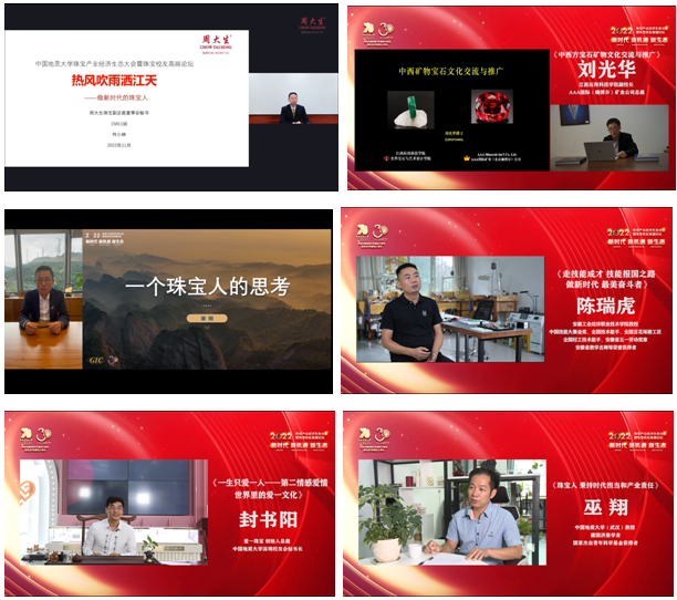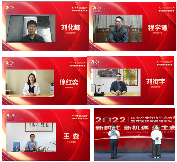 七秩榮光,寶教卅年,凝聚了所有地大人、珠寶人的辛勞與智慧;歸來少年,逐夢未來,續寫每位地大人、珠寶人的奮斗與創造。在欣賞完《寶教卅年 歸來少年》回顧片后,1992級校友、國家首飾質量檢驗檢測中心深圳實驗室副主任劉化鋒,1995級校友、武漢新金珠寶首飾有限公司總經理程學謙,2000級校友、HRD Antwerp中國區總監徐紅奕,2006級校友、上海建橋學院珠寶學院院長劉銜宇,2010級校友、深圳凡盛實業有限公司總經理王森等校友代表表達對母校和恩師的感激之情和對學弟學妹的諄諄告誡,珠寶學院在校生代表2020級本科生楊俊峰和2021級本科生馬如璇同學線下發言,表示要向優秀校友學習,勵志成才,做未來珠寶行業的棟梁。