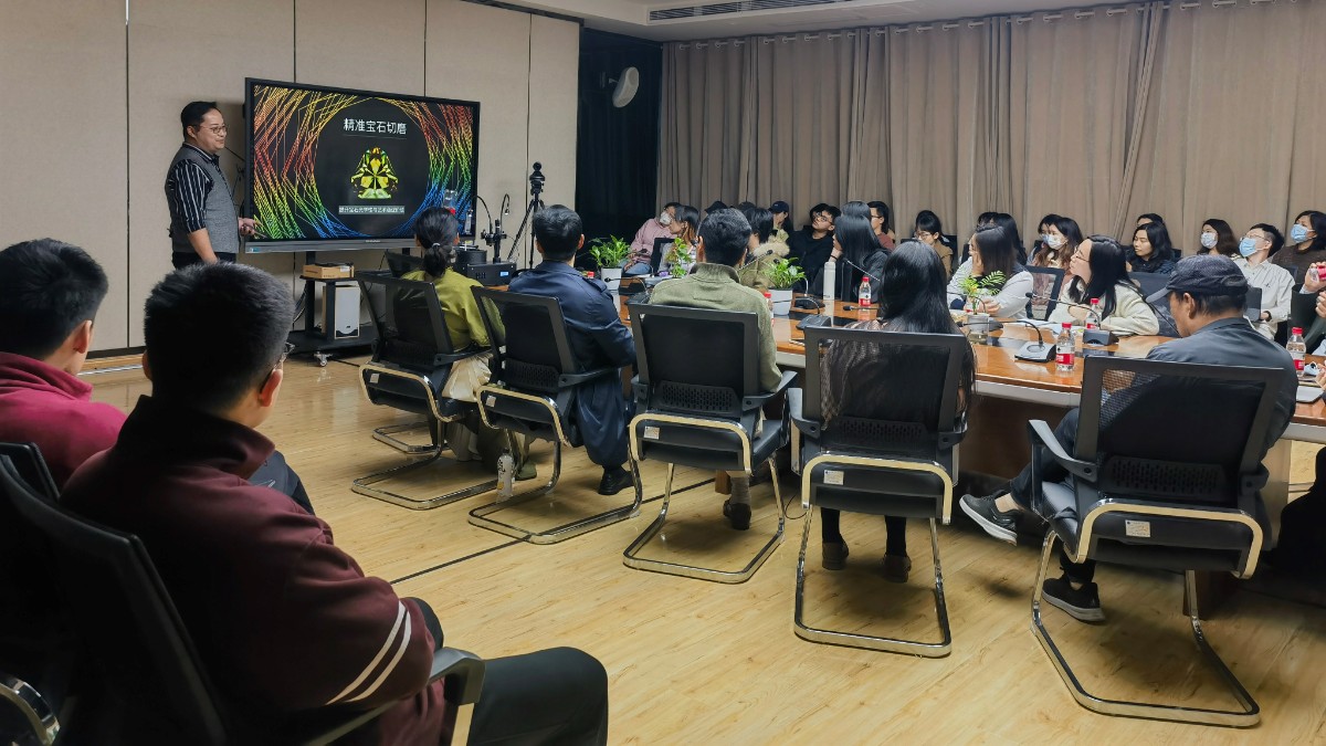 胡乃尹先生從自身經(jīng)歷與感悟出發(fā),結(jié)合全球?qū)毷心ギa(chǎn)業(yè)發(fā)展現(xiàn)狀,從寶石切磨的本質(zhì)與目的、寶石切磨工藝、市場與藝術(shù)價(jià)值以及追求極致工藝的價(jià)值體現(xiàn)等四個(gè)方面為師生講解他在寶石切磨領(lǐng)域的開創(chuàng)性工藝與技術(shù)。胡乃尹以自主研發(fā)的寶石切磨設(shè)備切入,提出“設(shè)備”、“技術(shù)”和“人心”三要素相互配合,介紹了光學(xué)等科學(xué)理論在寶石切磨工藝中的核心價(jià)值,分享了寶石切磨藝術(shù)作品的創(chuàng)作內(nèi)涵,將當(dāng)代科學(xué)與藝術(shù)融為一體,詮釋他所追求的極致美。