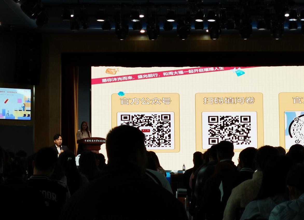 2023年3月17日下午,周大福珠寶集團有限公司校園招聘會在中國地質大學(武漢)珠寶學院四樓報告廳順利召開。公司總部招聘經理梁端、華中區人力資源總監楊慧、武漢區域高級業務經理李娜、徐敏出席會議。來自全校的百余名學生參加了宣講會。
