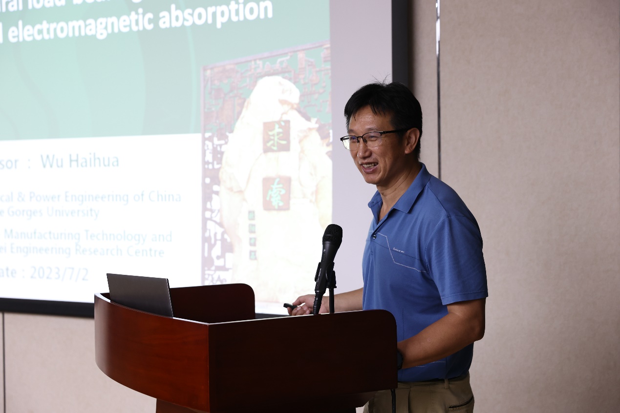 第三場報告由湖北三峽大學吳海華教授圍繞“Porous NFG/SiCnw Composites Fabricated by SLS for Structural Load-bearing and Functional Integrated Electromagnetic Absorption”進行展開。吳海華教授團隊以熱固性酚醛樹脂為粘結劑,采用選擇性激光燒結3D打印技術和高溫燒結工藝制備了具有多孔結構的NFG/SiCnw吸波材料,闡明了NFG/SiCnw復合材料中電磁波的協同衰減機理,指出將SLS 3D打印技術與高溫燒結工藝相結合制備的復合材料在工業電磁吸收中具有巨大的實際應用潛力。