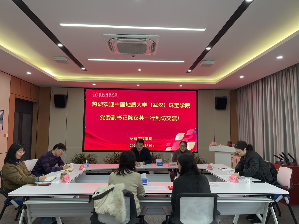2024年1月3日,中國地質大學(武漢)珠寶學院黨委副書記陳漢英、輔導員湯凡渺老師赴南京到金陵科技學院調研交流、看望校友。金陵科技學院材料工程學院黨委書記葉原豐、黨委副書記陳智慧、輔導員教師,珠寶系教師、我院校友蔡逸濤、周歷參加調研座談會。
