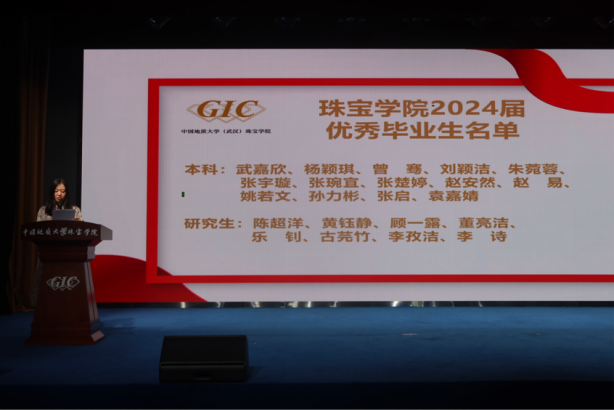 珠寶學院為畢業生準備畢業紀念品,寶石系主任陳濤宣讀優秀畢業生名單,寶石系教授殷杰為同學們頒發紀念品,畢業生代表上臺領獎。