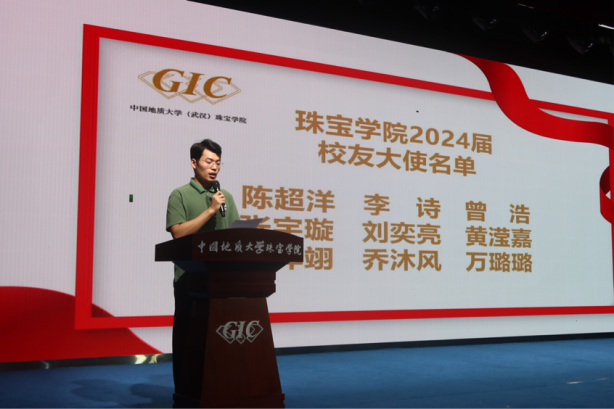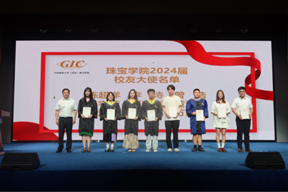 學院輔導員曹佳樂宣讀中國地質大學(武漢)珠寶學院2024屆校友大使聘任文件,院黨委書記薛保山為校友大使頒發聘書。