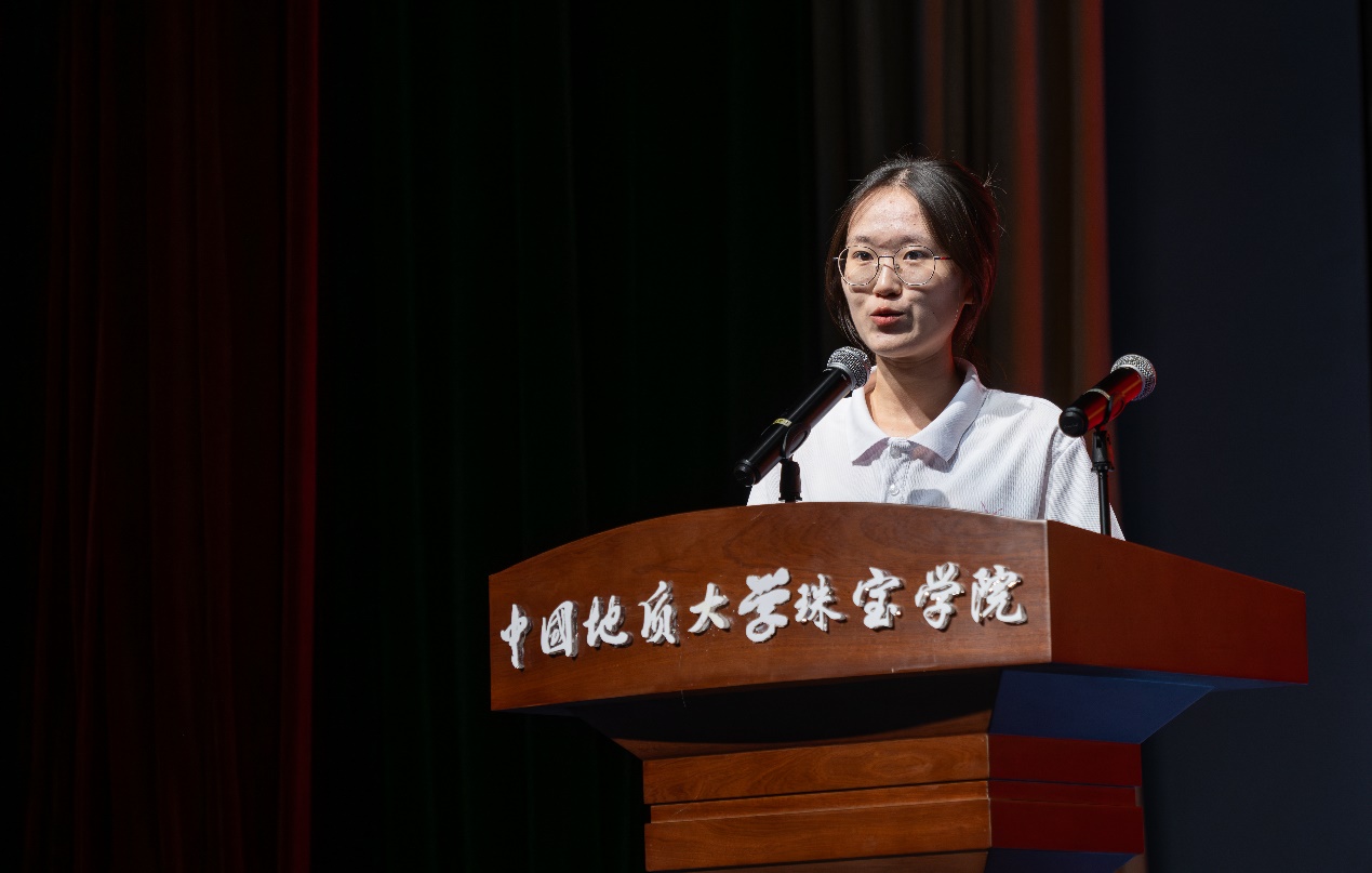本科生新生代表方婉晶講述了自己與地大結緣的故事,分享了對地大和珠寶學院從陌生到漸漸熟悉的心路歷程,也不斷勉勵自己和同學們,在新的征程上奮勇拼搏。