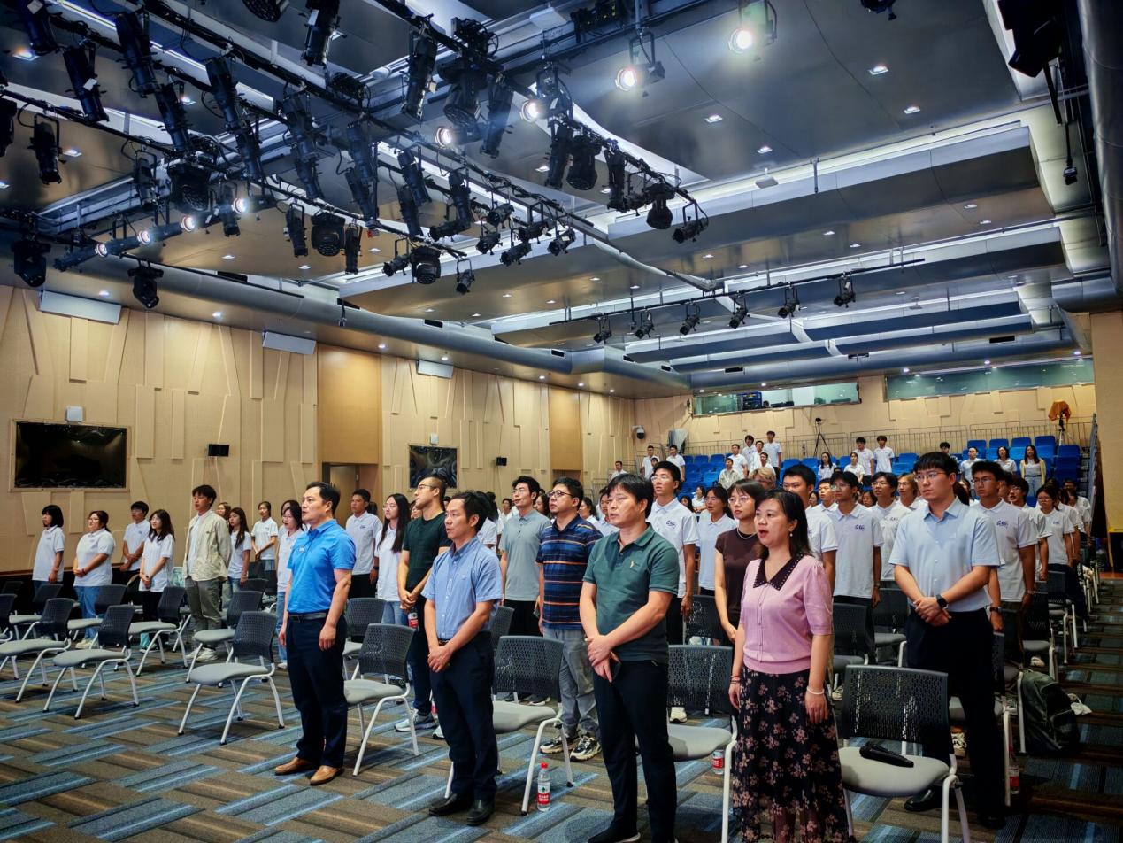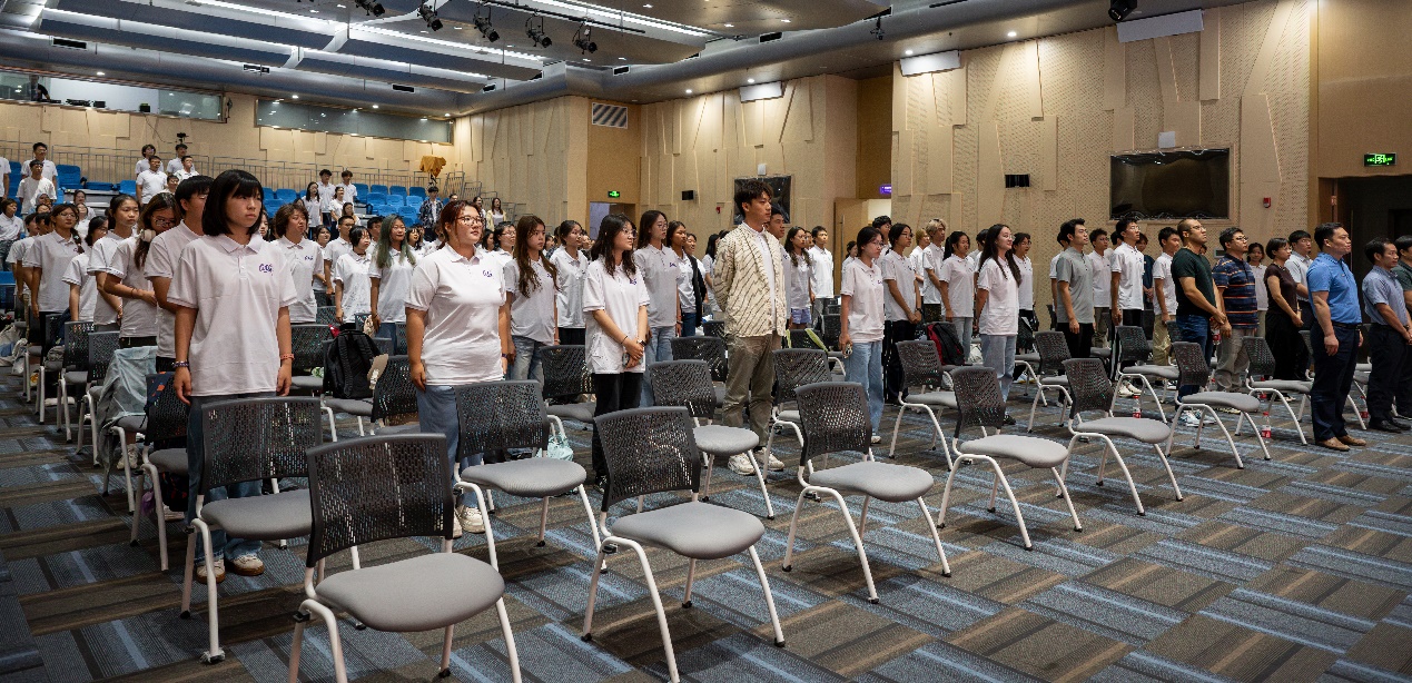 全場觀眾一同起立,慷慨激昂地奏唱國歌。師生的愛國之情溢于言表,朝氣蓬勃的同學們展現著青春光彩。