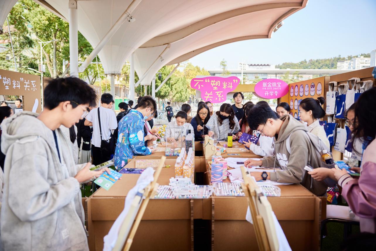 參加活動的師生們“瓶”票入場——攜舊塑料瓶或瓶蓋等廢棄塑料兌換印章獎勵?,F場參與再生塑料diy串珠、掛件、編繩等活動,繪制T恤,并參與抽獎。本次活動從現場搭建到手工材料,全部使用可回收板材和回收塑料等環保材料。旨在提高同學們對環保材料和環境保護重要性的認識。