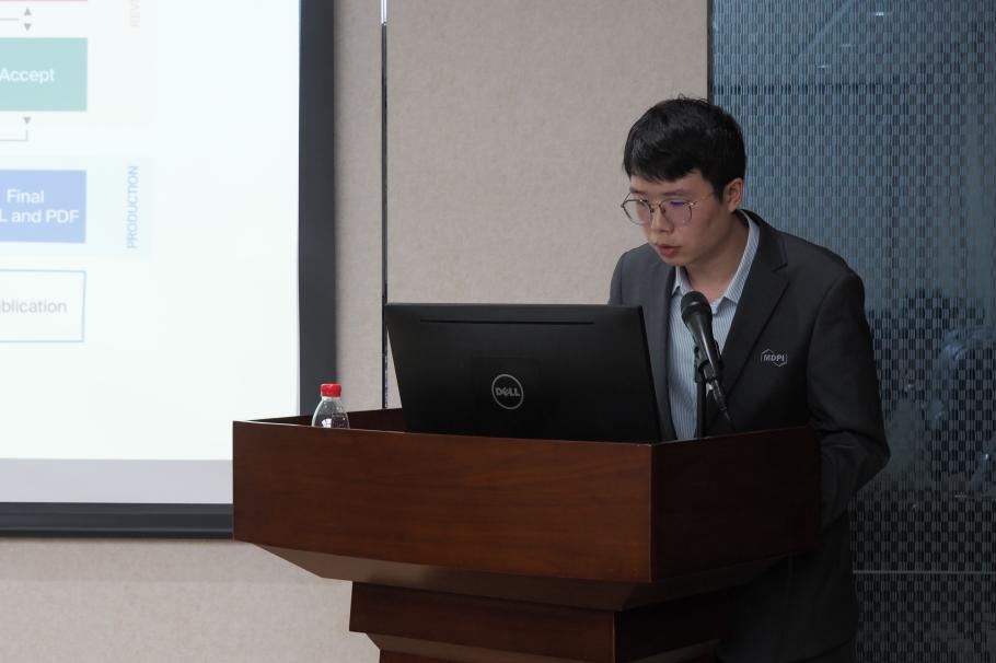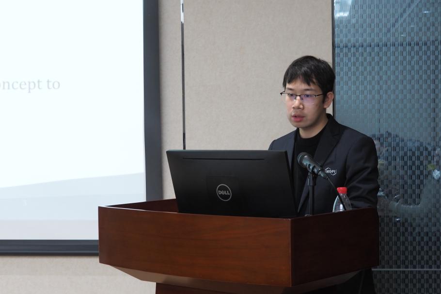 會(huì)議第一項(xiàng)議程是由 MDPI 出版專員鐘奕博士主講的英文科技論文寫作指南。鐘博士以投稿信的格式與內(nèi)容為切入點(diǎn),隨后系統(tǒng)講解了從標(biāo)題、摘要、關(guān)鍵詞、緒論、正文到結(jié)論等研究論文各部分的撰寫要點(diǎn)及注意事項(xiàng)。他的講解條理清晰、實(shí)例豐富,使同學(xué)們對(duì)論文投稿與撰寫流程有了全面而具體的認(rèn)識(shí),不僅構(gòu)建了清晰的認(rèn)知框架,也為今后獨(dú)立開展科技論文創(chuàng)作奠定了扎實(shí)的理論與實(shí)踐基礎(chǔ)。