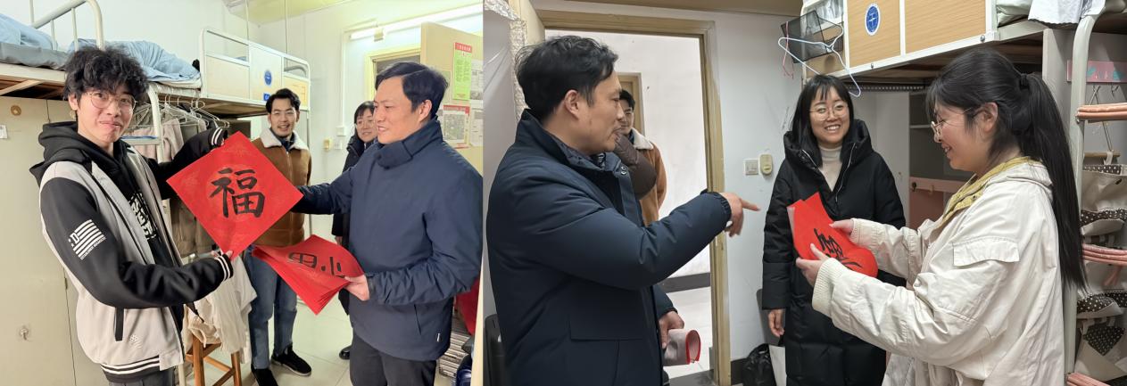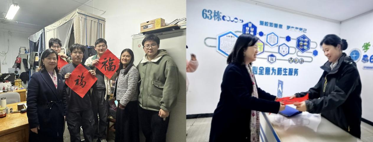 在走訪最后,老師們還特別為每個宿舍送上了手寫的“福”字,寄托著學院對同學們的美好祝福。每一張“福”字都代表著學院對同學們的關愛與期許,希望大家在新的一年里,學業進步、科研順利、生活愉快。這份溫暖的心意讓同學們感受到濃濃的關懷,激勵大家在未來的道路上勇敢前行、再創佳績。 同時老師們也為63棟女寢宿管送去了祝福,冬至幸福至,老師們希望把這份幸福分享給每一個人,同時希望在這個寒冷的冬天里老師與同學們可以互相關懷,共同迎接美好幸福的明天!