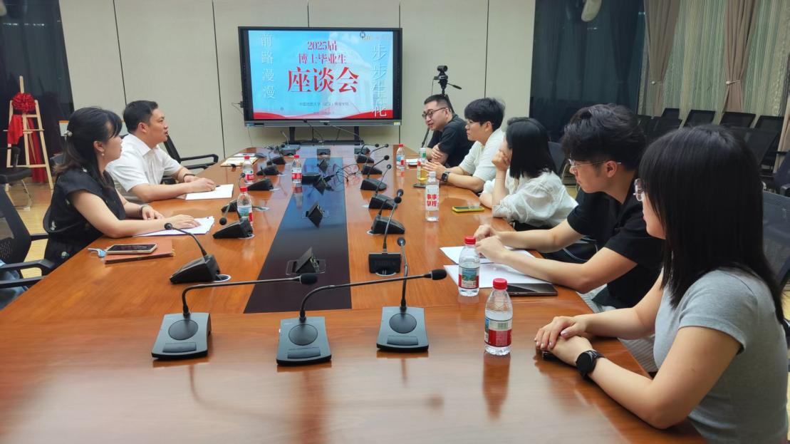 6月11日珠寶學院2025屆博士畢業生座談會在919會議召開。珠寶學院黨委書記薛保山、黨委副書記陳漢英、輔導員曹佳樂與五位博士生參加會議。