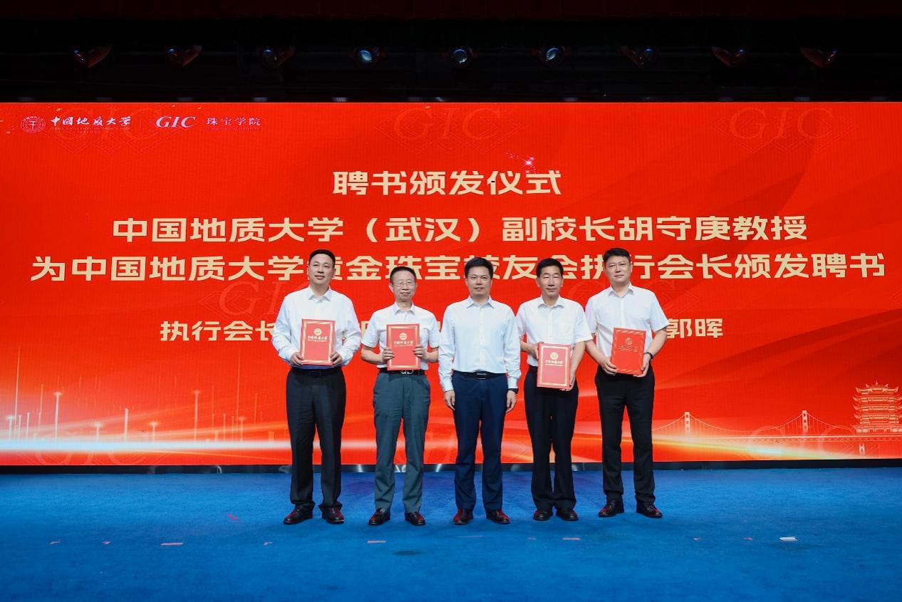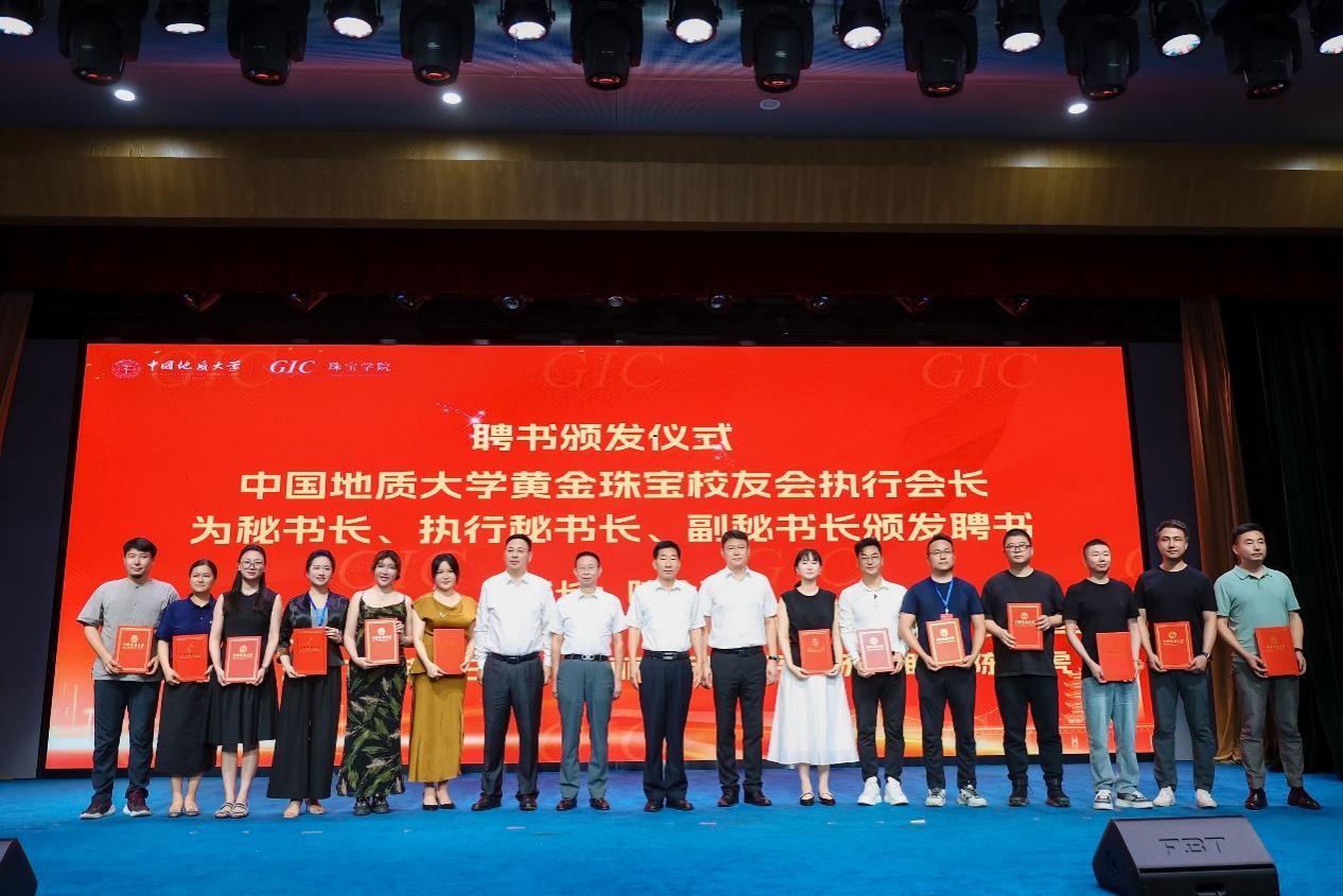 聘任儀式上,中國地質大學校友會副會長傅安洲教授為黃金珠寶校友會榮譽會長葉志斌、孫鳳民、陳春、袁心強頒發聘書。中國地質大學(武漢)副校長胡守庚教授為黃金珠寶校友會會長周宗文,執行會長王振、史洪岳、何小林、郭暉頒發聘書。黃金珠寶校友會執行會長為副會長、秘書長、執行秘書長、副秘書長頒發聘書。珠寶學院黨委書記薛保山和院長尹作為向黃金珠寶校友會理事頒發聘書。