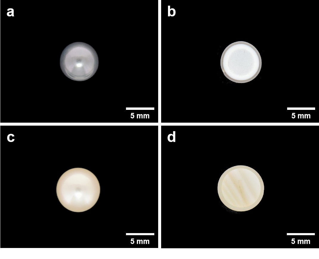 圖1 (a-b)空心陶瓷核珍珠與切開后橫截面的樣品照片;(c-d)普通Akoya珍珠與切開后橫截面的樣品照片