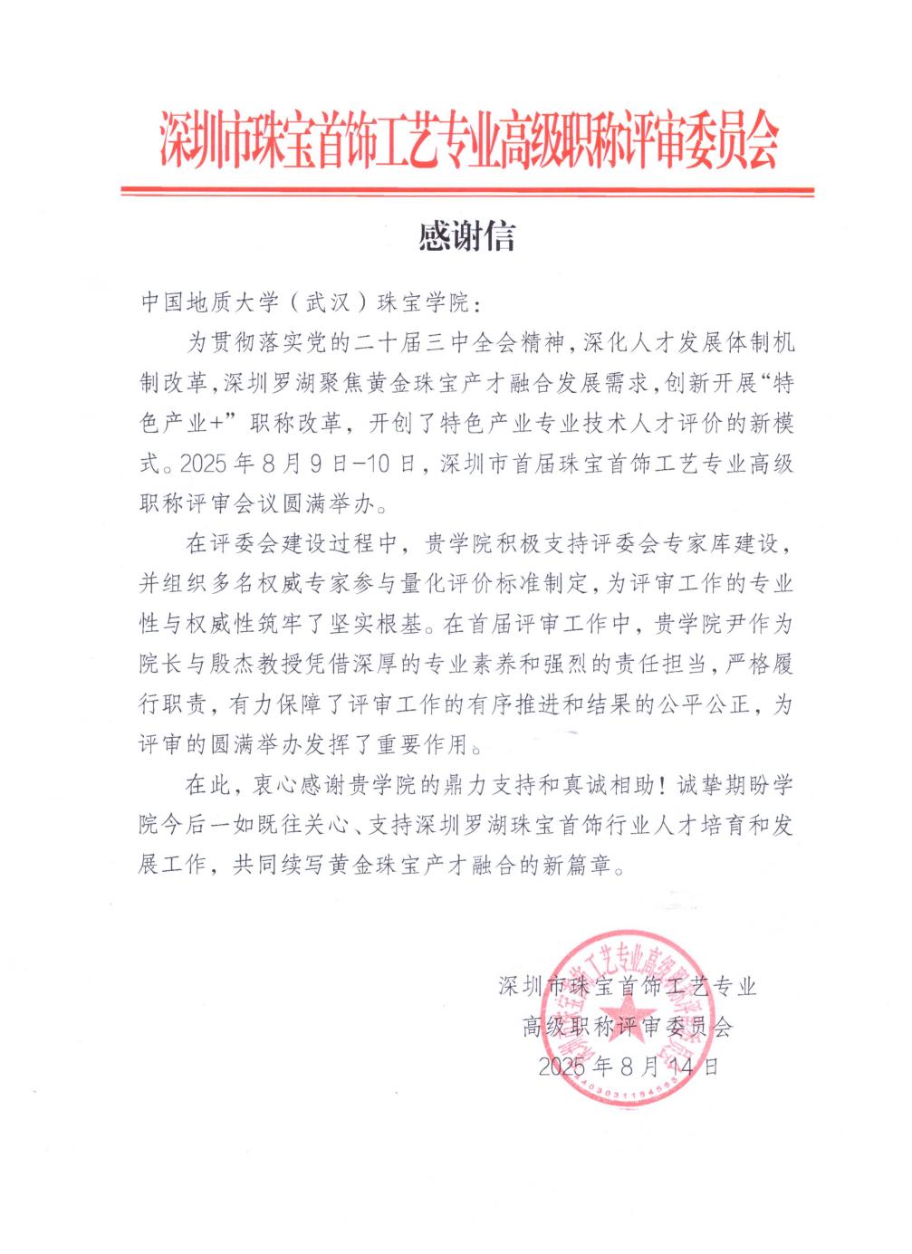 學院在此次評審工作作出突出貢獻,收到了深圳市珠寶首飾工藝專業高級職稱評審委員會的感謝信。信中寫到:“在首屆評審工作中,貴學院尹作為院長與殷杰教授憑借深厚的專業素養和強烈的責任擔當,嚴格履行職責,有力保障了評審工作的有序推進和結果的公平公正,為評審的圓滿舉辦發揮了重要作用。”