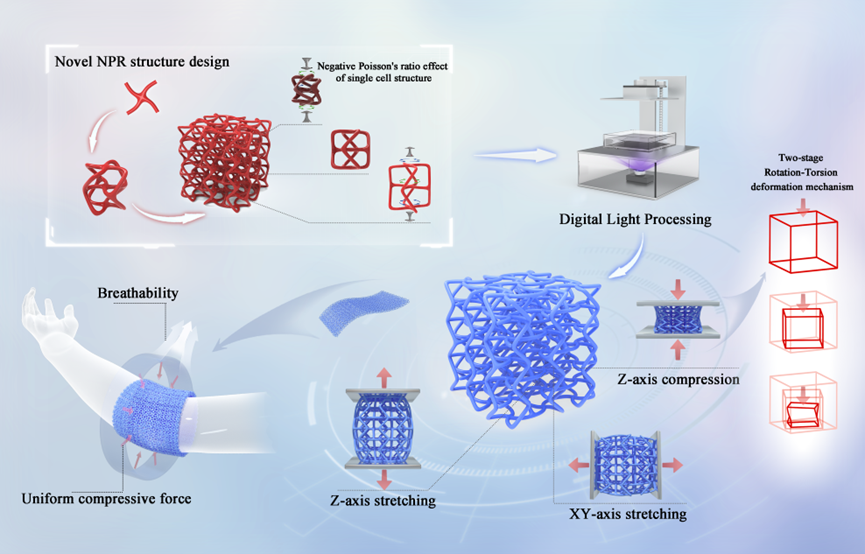 隨著可穿戴技術的發展,對材料輕量化、高韌性和人體貼合性提出了更高要求。負泊松比材料具有在縱向拉伸時橫向膨脹、壓縮時橫向收縮,展現出獨特的力學行為,尤其適用于復雜曲面貼合與能量吸收等場景。然而,傳統三維負泊松比結構存在制造難度大、性能調控困難等問題。為此,作者提出一種新型三維負泊松比結構設計策略,彌合了數字模型與實際制造之間的差距,通過創新設計三維手性負泊松比結構,實現了機械性能的可控調節,為柔性可穿戴提供了新的解決方案。