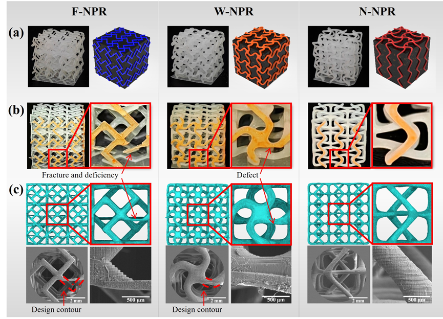 本研究基于二維交錯肋架構,設計出三種三維手性負泊松比結構(F-NPR、W-NPR、N-NPR),并采用數字光處理技術DLP(Digital Light Processing, DLP)實現高精度制造,揭示了結構設計與制造精度之間的內在聯系。結果表明,節點增強型N-NPR結構展現出優異的可成形性,尤其適用于DLP增材制造工藝(圖2、圖3)。
