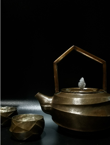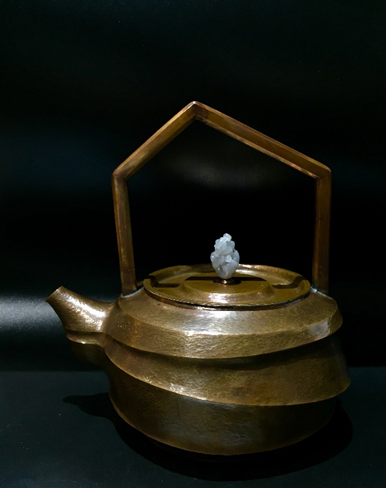 汪大江創作構思:作品《枯·山·水》在設計上借鑒了枯山水造園意境。壺體通過不斷變化的線條來表現水的流動感,壺鈕采用和田玉雕琢假山,以石代山。這些靜止不變的“山、水”具有使人寧靜的效果。器型以曲線表現水韻,金屬流光予其動感。器物既是水的容載者,亦被水所幻化,水與器相生相成、互為因果。工藝上采用銅包銀技藝,區別于一般的銅包銀作品,該作品最大的難點亦是亮點在于通體不開孔,一層銅一層銀一體鍛打而成。