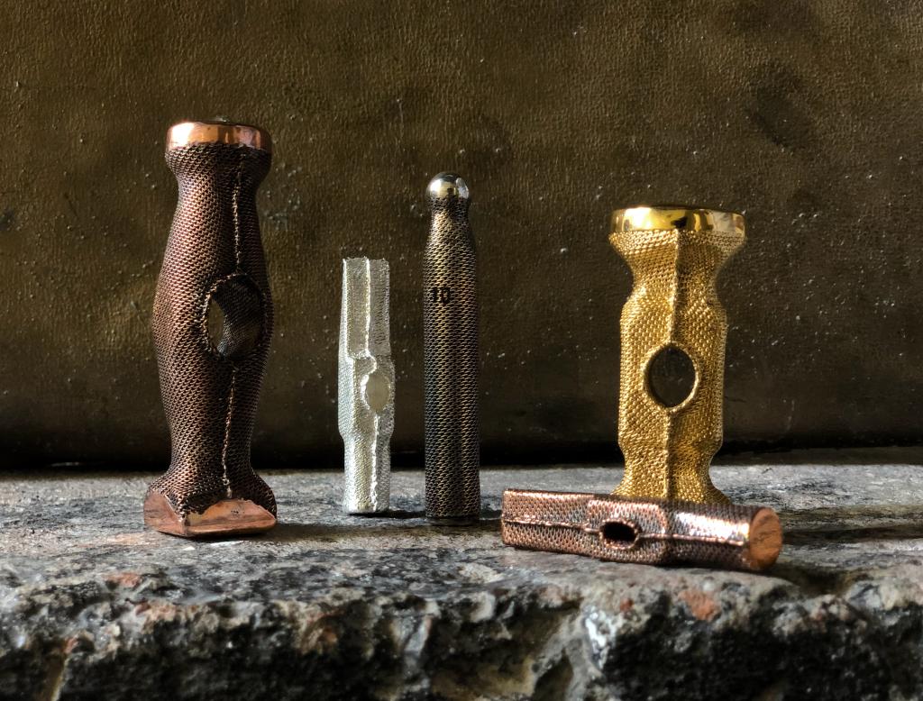 任開老師創作構思:日本民藝大師柳宗悅說:“工藝的美是用之美”。烏黑的工具上一道道劃痕與殘缺體現的是歲月凝固之美和使用者的生命印記。當“工藝”由名詞轉為動詞時,在工藝世界的邏輯中,“萬物生長”的過程就展現了每一種工藝特有的痕跡之美?!豆に嚭圹E》這個作品主要運用了花絲工藝中“泡匹”這樣一種工藝形式來創作。它以我們金屬工藝人天天用到的工具作為母形創作而來,并借用了當代花絲工藝創作過程中留下的獨特工藝痕跡紋理來表達工具與人內在關系上的特殊意義。