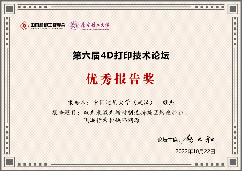 近日,我院殷杰教授所作題為《雙光束激光增材制造拼接區熔池特征、飛濺行為和缺陷溯源》報告獲得第六屆4D打印技術論壇“優秀報告獎”。