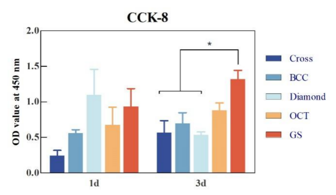 研究團隊采用CCK-8法、細胞活死染色、細胞骨架染色、實時熒光定量PCR等技術,系統地研究了不同點陣結構的生物相容性及生物學性能,5種點陣結構在細胞毒性、細胞黏附和增殖方面都表現出良好的性能,其中GS點陣結構對成骨分化表現出更明顯的促進作用。GS、BCC和OCT點陣結構有利于新血管生成且能夠調控巨噬細胞向M2型極化進,從而促進組織修復。