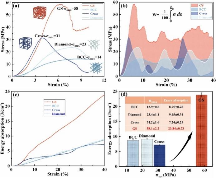 研究團隊利用LPBF技術制備了仿生異構GS點陣結構,并設計了三種不同孔隙率(70%、80%和90%)與四種常見的傳統點陣結構 (BCC、OCT、Cross和Diamond) 進行了對比,并通過有限元模擬仿真,計算不同應變條件下不同點陣結構的壓縮變形能力。結果顯示GS點陣結構展示出最好的壓縮強度(58MPa) 和能量吸收能力 (23.84J/cm3),達到了輕量化 (高孔隙率) 與高力學性能之間的平衡。